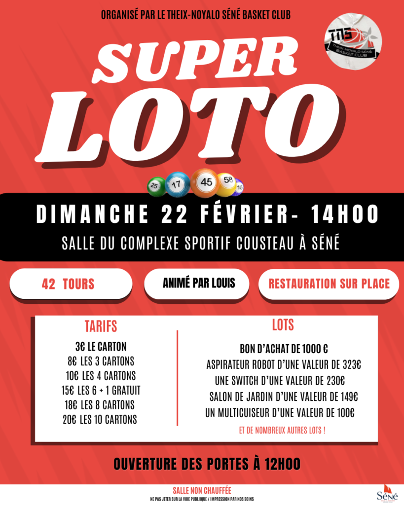 👉 Ne manquez pas ce Super Loto à Séné, une occasion parfaite pour tenter votre chance, gagner des lots exceptionnels et soutenir le TNSBC, votre club sportif local !